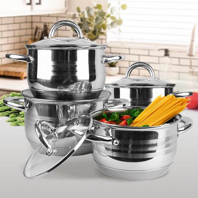 Показати оптові ціниНабір посуду Maestro MR-3513-8 виготовлений з високоякісної нержавіючої сталі, що гарантує практичність, довговічність і бездоганний зовнішній вигляд посуду. Багатошарове дно дозволяє рівномірно розподіляти і значно довше зберігати тепло по стінках і дну посуду, що запобігає пригорання їжі і забезпечує більш швидке готування страв. Кришка з термостійкого скла дозволяє контролювати процес приготування без втрати тепла.